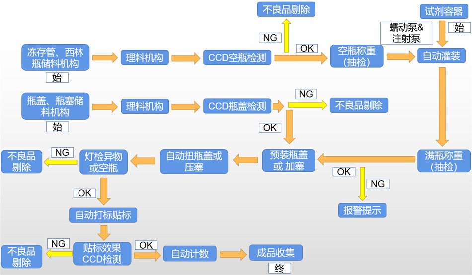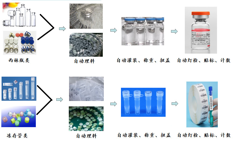 此類設(shè)備可實(shí)現(xiàn)西林瓶&凍存管料倉儲(chǔ)料—>自動(dòng)理料供料—>自動(dòng)檢測(cè)空瓶—>自動(dòng)定位—>自動(dòng)灌裝—>自動(dòng)燈檢異物—>自動(dòng)供瓶蓋—>自動(dòng)預(yù)裝瓶蓋—>自動(dòng)擰蓋—>自動(dòng)打標(biāo)貼標(biāo)—>CCD檢測(cè)擰蓋及貼標(biāo)效果—>自動(dòng)計(jì)數(shù)出料緩存—>自動(dòng)碼盤裝箱等一系列動(dòng)作,使該類產(chǎn)品的灌裝擰蓋貼標(biāo)工序?qū)崿F(xiàn)完全自動(dòng)化,提升產(chǎn)能及品質(zhì),節(jié)省人工。