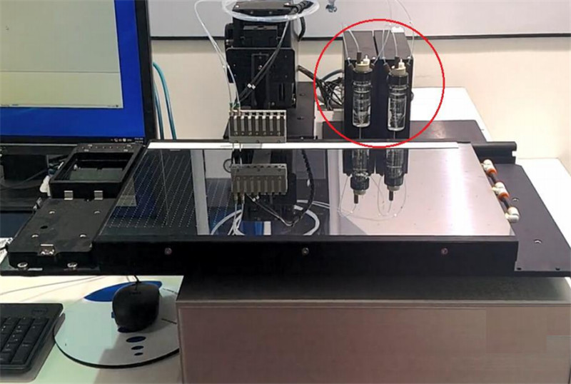 (1)平臺(tái)可根據(jù)需要配置多種噴頭,適合用于金標(biāo)試劑、封閉液、預(yù)處理液等的分散定量噴點(diǎn),噴頭由高精度步進(jìn)泵供給溶液。